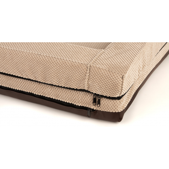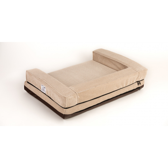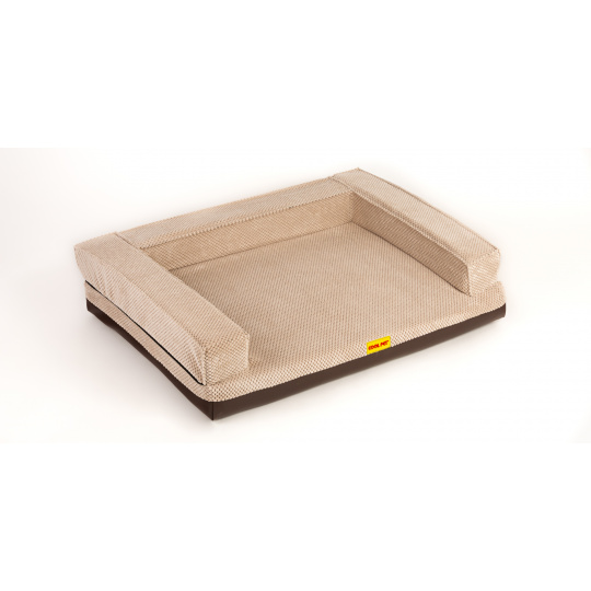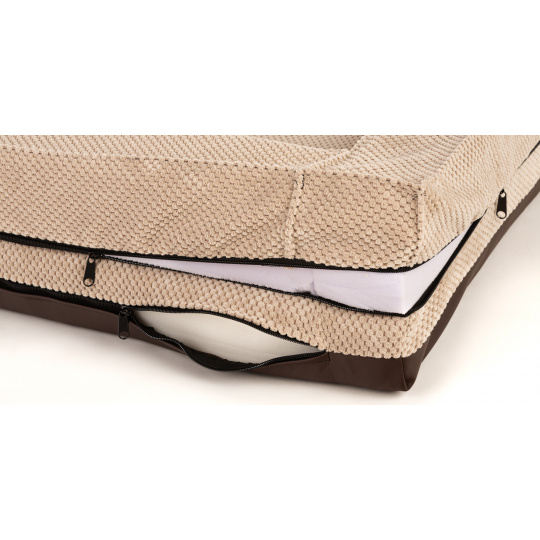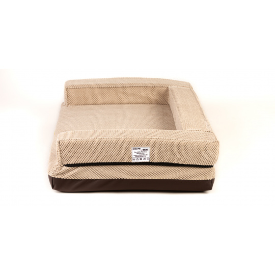 Orthopädisches Hundebett, gepolsterter Rand - beiger Velours/braunes Kunstleder