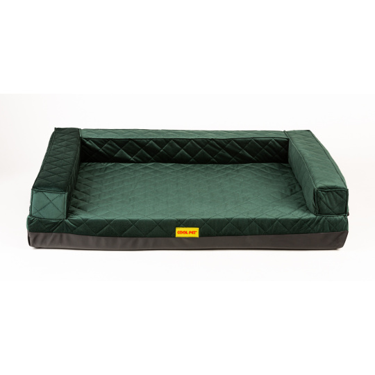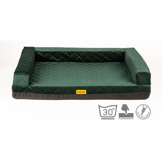 Orthopädisches Hundebett, 5 Größen, gepolsterter Rand, 10 cm hoher Memory-Schaum, grüner gesteppter Velours/schwarzes Kunstleder, Sofa 70x52cm, Innenmaß 50x42cm
